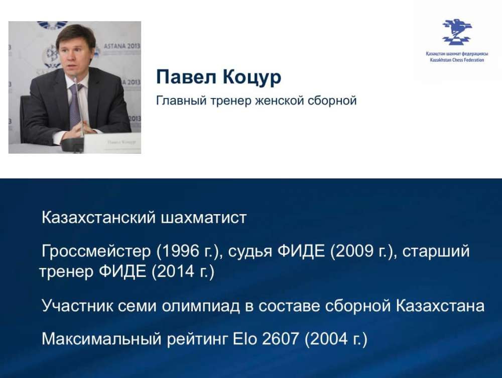 Национальную женскую сборную в качестве главного тренера поведёт международный гроссмейстер, старший тренер ФИДЕ, победитель международных турниров Павел Коцур из Нур-Султана. За последние годы Павел был главным тренером обеих сборных, мужской и женской, а в рамках Олимпиады 2022 года сфокусируется на подготовке и выступлении женской сборной, отметил Садвакасов.
