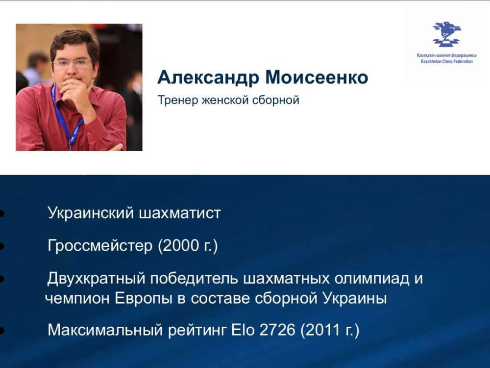 Для усиления процесса подготовки женской сборной к Олимпиаде также привлечён известный украинский гроссмейстер, двукратный олимпийский чемпион в составе сборной Украины, чемпион Европы среди мужчин Александр Моисеенко.