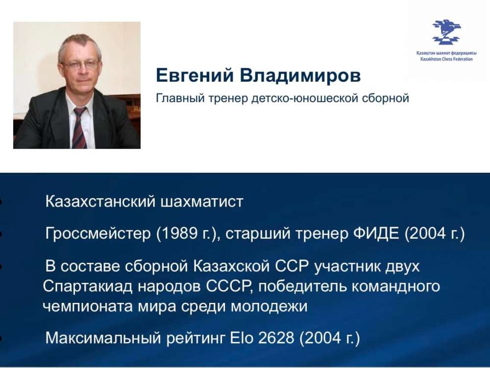 Детско-юношескую сборную будет готовить международный гроссмейстер Евгений Владимиров из Алматы. Он старший тренер ФИДЕ, бывший главный тренер сборных Казахстана, Испании и Индии, экс-тренер и секундант Гарри Каспарова. Признавался лучшим тренером Азии, воспитал плеяду ярких индийских шахматистов, среди его воспитанников − чемпионы мира в молодёжных категориях, гроссмейстеры в 13 лет, гроссмейстеры в топ-20 шахматистов мира и другие.