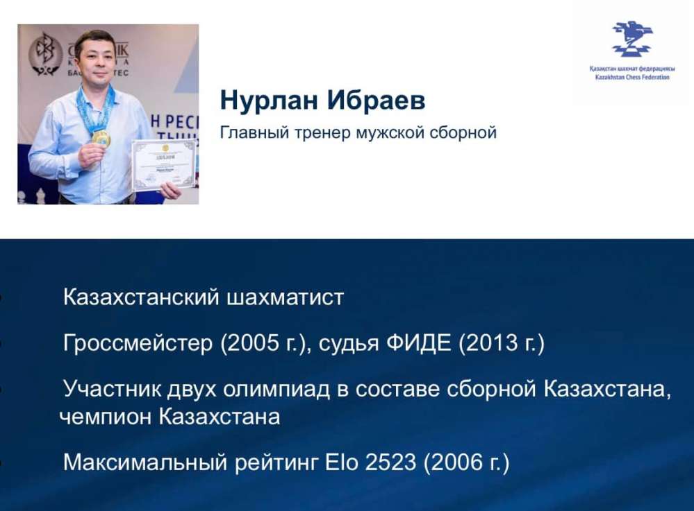Главным тренером мужской сборной стал Нурлан Ибраев из Нур-Султана − чемпион Казахстана среди мужчин, участник шахматных олимпиад. Нурлан около семи лет был государственным тренером, имеет большой опыт организационной работы.