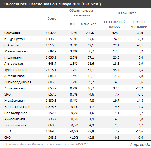 Наибольший рост количества жителей наблюдается в Нур-Султане (+5,3 процента) и Алматы (+3,3 процента). Сокращение населения зафиксировано в шести регионах: Северо-Казахстанской (−1 процент), Восточно-Казахстанской (−0,6 процента), Костанайской (−0,5 процента), Акмолинской (−0,3 процента), Павлодарской (−0,2 процента) и Карагандинской (−0,1 процента) областях.