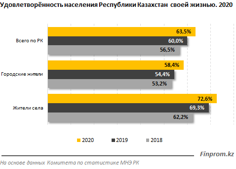 В Комитете по статистике МНЭ провели ежегодный опрос казахстанцев о качестве жизни. По результатам выборочного обследования, 63,5 процента респондентов удовлетворены своей жизнью, при этом в сельской местности довольных жизнью казахстанцев значительно больше (72,6 процента), чем в городской (58,4 процента). В то же время мужчин, удовлетворённых своей жизнью, среди опрошенных оказалось больше (61,8 процента), чем женщин (58,5 процентов).