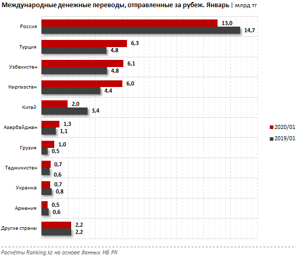 Чуть более 71 процент от всего объёма отправленных за рубеж денег приходится лишь на четыре страны. Лидирует Россия, куда в январе было отправлено 13 миллиардов тенге — на 11,2 процента меньше, чем в прошлом году.