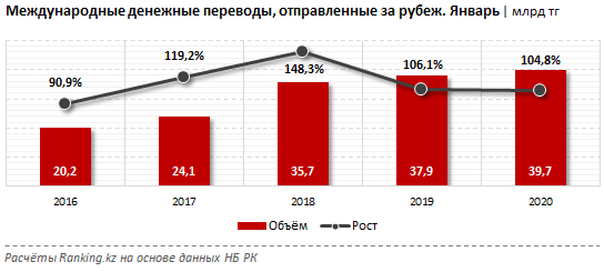 Объём средств, отправленных через системы международных денежных переводов в январе текущего года составил 39,7 миллиарда тенге, передает BaigeNews.kz со ссылкой на Ranking.kz.