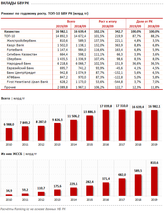 В то же время некоторые фининституты за год заметно усилили позиции на рынке вкладов. Так, среди крупнейшей десятки банков — держателей депозитов абсолютный лидер по годовому росту вкладов — Жилстройсбербанк: сразу плюс 37,5%, до 810,6 млрд тенге. Банк показывает рост год от года. Так, в сентябре 2018-го годовой рост составлял 22,3%, годом ранее — 29,8%, в 2016-м — 31,5%. В целом же по сектору в эти годы наблюдалась стагнация.