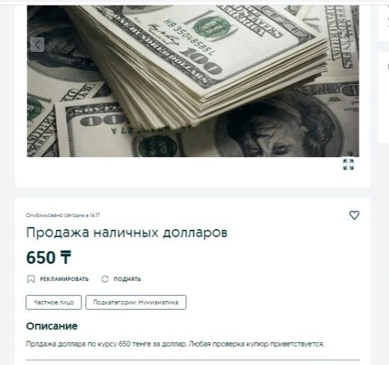 Казахстанцы продают доллары на онлайн-сервисе объявлений OLX, передает BaigeNews.kz.