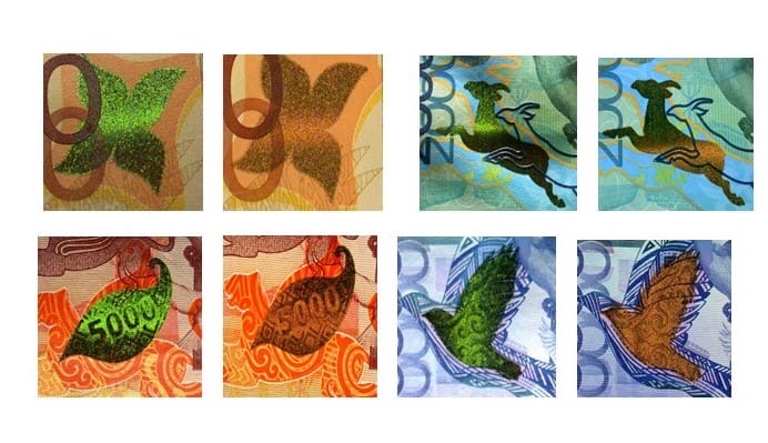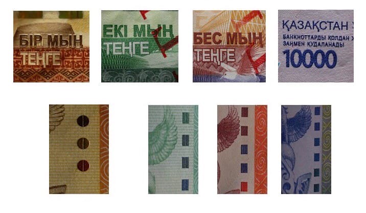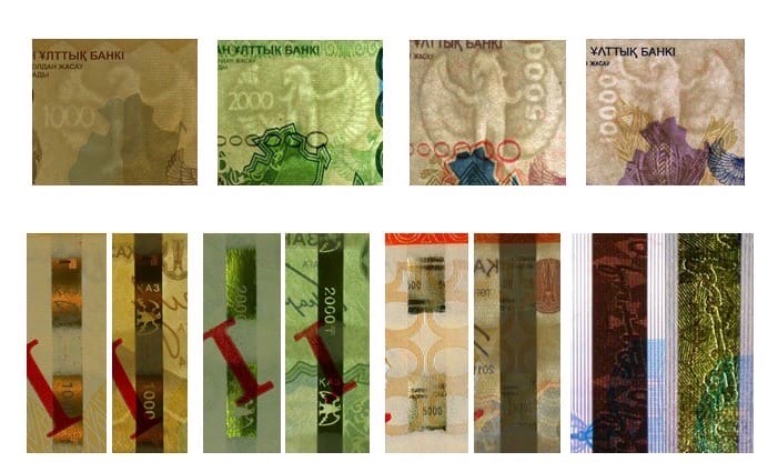 На оборотной стороне банкнот две тысячи и пять тысяч тенге имеется голографическая полоса. Изображения на голограмме переливаются и имеют динамический эффект.