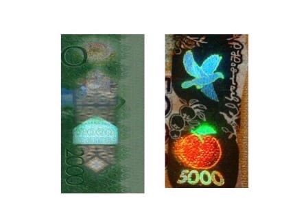 На оборотной стороне банкнот две тысячи и пять тысяч тенге имеется голографическая полоса. Изображения на голограмме переливаются и имеют динамический эффект.