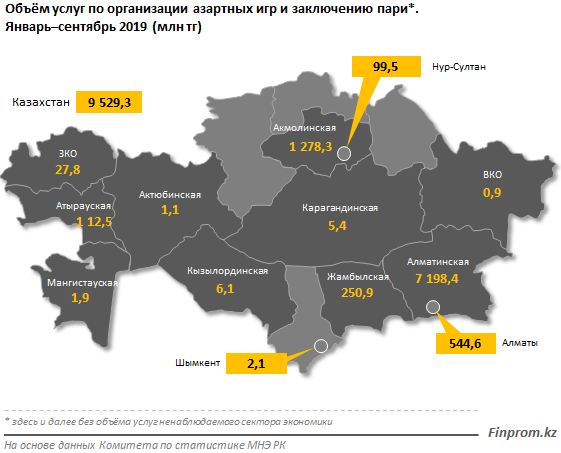 Наибольший объём услуг приходится на области с игорными зонами — Алматинскую (7,2 миллиарда тенге) и Акмолинскую (1,3 миллиарда тенге), чьи доли от Казахстана составляют 75,5% и 13,4% соответственно.