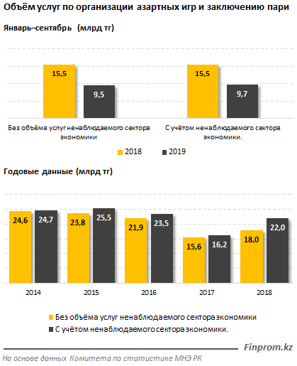 Объём услуг по организации азартных игр и заключению пари за январь–сентябрь 2019 года с учётом ненаблюдаемого сектора экономики составил 9,7 миллиарда тенге — на 37,4% меньше, чем за январь–сентябрь 2018-го (ИФО — 57,8%).