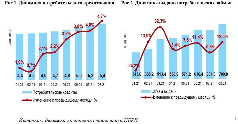"По итогам 8 месяцев текущего года потребительские займы увеличились на 23,8% до 5,4 трлн тенге, или 33% от кредитов экономике (на начало года 30%), значительно ускорившись по сравнению с 2020 годом (в 2020 году потребительские займы увеличились на 4,3%). Рост данного показателя в текущем году значительно превышает номинальный рост ВВП и доходов населения, что свидетельствует о повышающихся рисках на рынке потребительского кредитования.