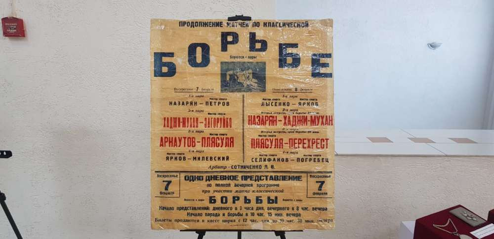 "70 процентов – это фотографии и документы. К примеру, здесь вы можете увидеть афишу матча по классической борьбе на 7 февраля (год не указан) между "мастерами спорта Хаджи-Муханом и Загоруйко", − сообщила праправнучка Кажымукана.