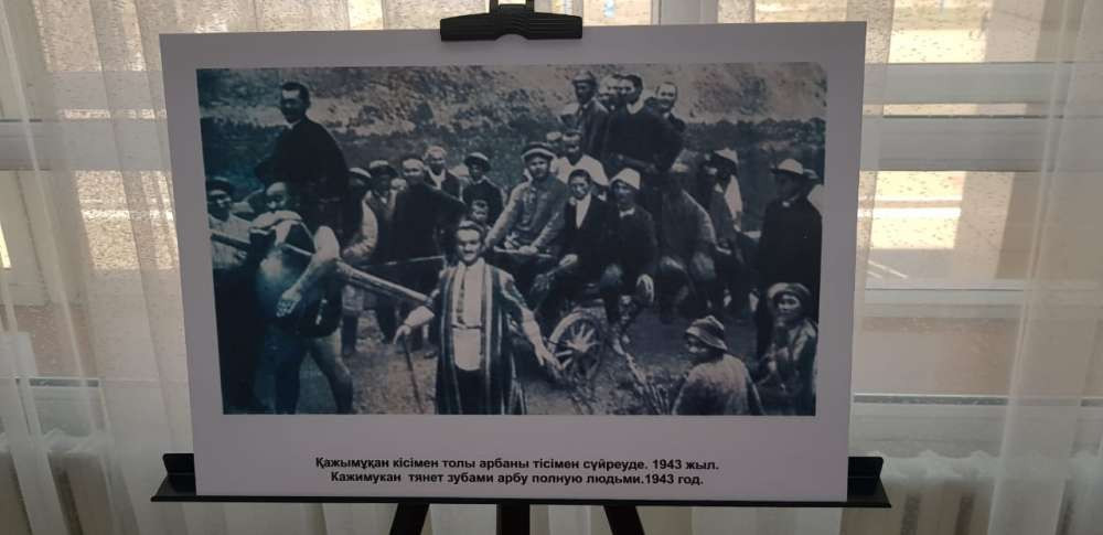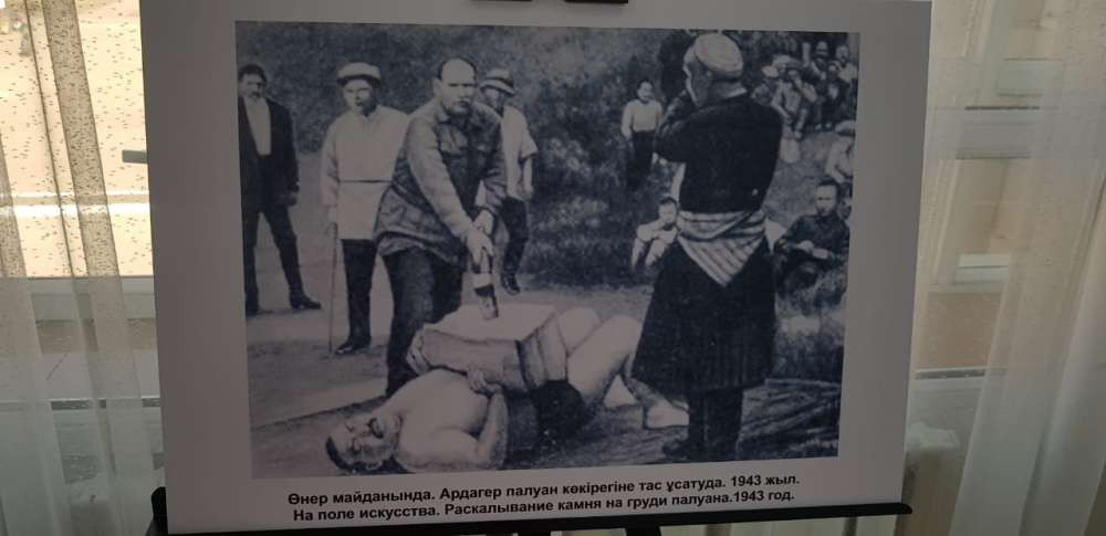 В фотографиях запечатлены яркие моменты из жизни и спортивной карьеры борца. Кажымукан тянет арбу, полную людей. Да еще и на плечах сидит молодой человек. Снимок датируется 1943 годом. А значит, ему было 72 года!