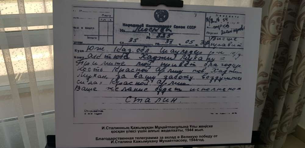 Благодарственная телеграмма за вклад в Великую победу от Иосифа Сталина Кажымукану Мунайтпасову, 1944 год.