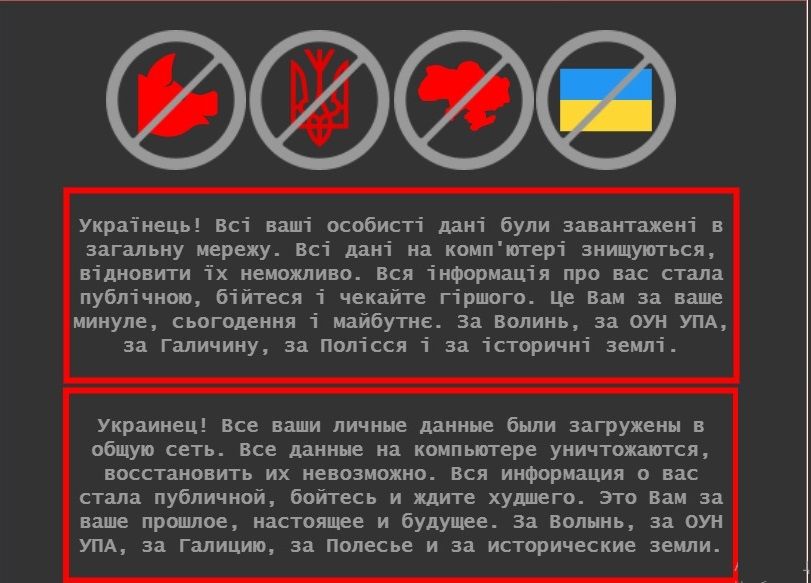 "Украинец! <…> Вся информация о вас стала публичной, бойтесь и ждите худшего. Это Вам за ваше прошлое, настоящее и будущее. За Волынь, за ОУН-УПА (запрещенная и признанная экстремисткой организация в России – прим.ред.), за Галицию, за Полесье и за исторические земли", — говорится в обращении.