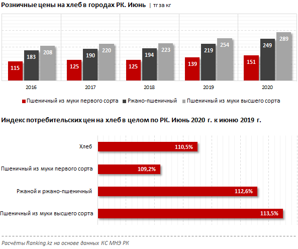 "В городах РК пшеничный хлеб из муки первого сорта в июне 2020-го стоил в среднем 151 тенге за килограмм (+9 процентов за год), из муки высшего сорта – 289 тенге за килограмм (+13,6 процента), ржано-пшеничный – 249 тенге за килограмм (+13,8 процента). Среди крупных городов и мегаполисов РК пшеничный хлеб из муки первого сорта дороже всего обходился жителям Атырау (178 тенге за килограмм) и Актау (173 тенге за килограмм). Дешевле всего такой хлеб стоил в Алматы (132 тенге за килограмм) и Таразе (138 тенге за килограмм)", – отмечает агентство.