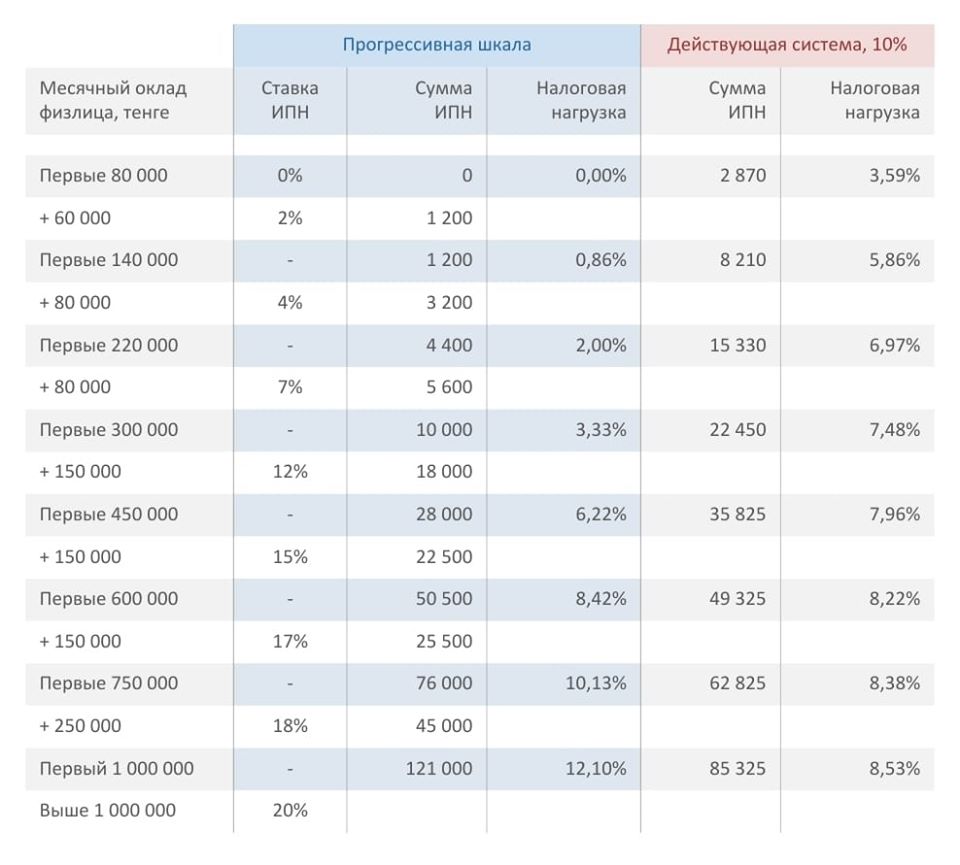 "Есть плоская шкала, когда при любом уровне доходов одна ставка, и прогрессивная шкала, когда чем выше доход, тем выше ставка (точнее на каждый следующий отрезок дохода более высокая ставка). Плюсы простой шкалы - в удобстве расчета, а плюс прогрессивной шкалы - в справедливости, когда богатые на себя берут большую нагрузку, помогая снизить нагрузку для бедных. Развивающиеся страны, где вопросы справедливости обычно менее успешно реализованы, тяготеют к плоской шкале, а развитые - к прогрессивной. Но неважно какая шкала, есть еще вопрос уровня нагрузки - чем выше нагрузка, тем больше мотивация уйти в тень, особенно, если хромает администрирование и мотивация населения вообще платить налоги. Конечно, когда говорим о нагрузке, надо учитывать и другие платежи, то есть совокупную. У нас, например, много различных платежей, и нагрузка на ФОТ (фонд оплаты труда - прим. ред.) достаточная, даже если ставка ИПН ниже, чем в других странах", - говорится в публикации.