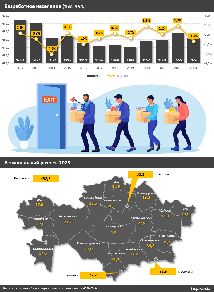 По итогам 2023 года в Казахстане насчитывалось 452,2 тыс. безработных — на 1,3% меньше, чем годом ранее, передаёт BaigeNews со ссылкой на Finprom.