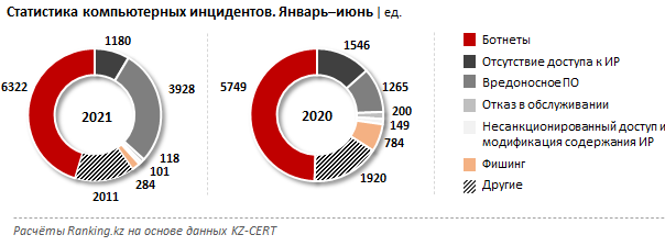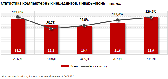 За первое полугодие 2021 года, по данным службы реагирования на компьютерные инциденты KZ-CERT, было зарегистрировано более 13,9 тысячи случаев нарушения компьютерной безопасности — на 20,1 процента больше, чем за аналогичный период прошлого года. Это самый высокий показатель за все время наблюдений.