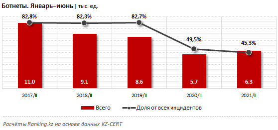 За январь–июнь было зарегистрировано 6,3 тысячи инцидентов, связанных с ботнетами — на 10 процентов больше, чем годом ранее. До этого три года подряд их количество сокращалось.