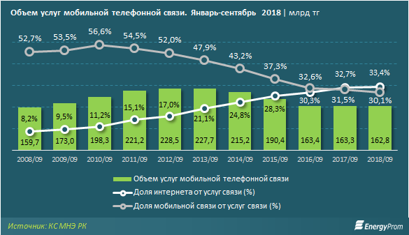 Доля мобильных операторов от общего объема услуг связи составила за январь-сентябрь текущего года всего 30,1%, против 31,5% в аналогичном периоде годом ранее, 47,9% - пять лет назад, и 52,7% - десятью годами ранее.