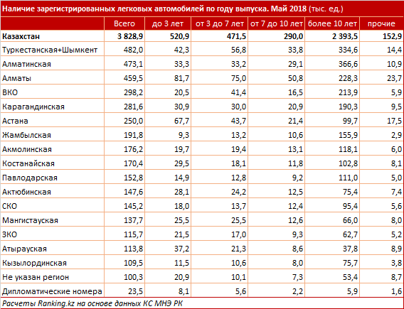 По количеству легковых автомобилей на конец мая текущего года лидирует Туркестанская область и город Шымкент - 482 тыс единиц, где преобладают авто возрастом старше 10 лет, доля которых составляет 69,4 %.