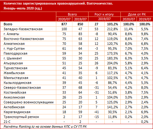 Также отмечается, что в июле зафиксирован рост взяточничества на 69,7 процента (56 фактов) по сравнению с аналогичным месяцем 2019 года. А в июне 2020 года зарегистрировано 114 таких правонарушений.