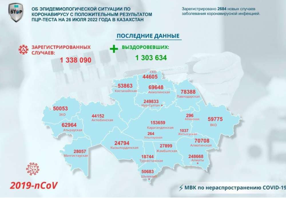 За прошедшие сутки зарегистрировано 2684 новых случая заболевания коронавирусной инфекцией, передаёт BaigeNews.kz со ссылкой на данные МВК по нераспространению COVID-19.