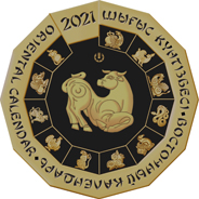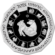 На реверсе монет в центральной части изображение быка – символа 2021 года по восточному календарю. По периметру монеты расположены надписи "2021", "ШЫҒЫС КҮНТІЗБЕСІ", "ВОСТОЧНЫЙ КАЛЕНДАРЬ" и "ORIENTAL CALENDAR". С внутренней стороны монет расположены остальные одиннадцать символов восточного календаря.