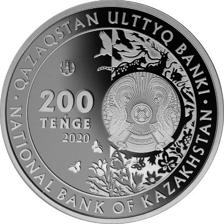 На аверсе монеты в центральной части изображен Государственный герб Республики Казахстан. Слева и справа – элементы национального орнамента. По окружности монеты – надпись QAZAQSTAN ULTTYQ BANKI • NATIONAL BANK OF KAZAKHSTAN. В нижней части – надпись 100 TEŃGE, обозначающая номинал монеты.