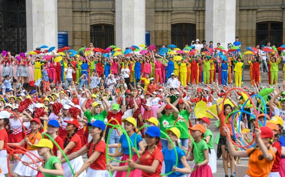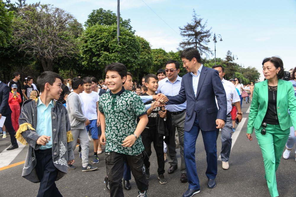 В праздничном шествии, стартовавшем на площади Астана по улицам Толе би и Панфилова прошли колонны барабанщиков, чирлидеры, духовые оркестры и танцевальные коллективы. Парад завершился ярким флэшмобом на улице Жибек жолы.