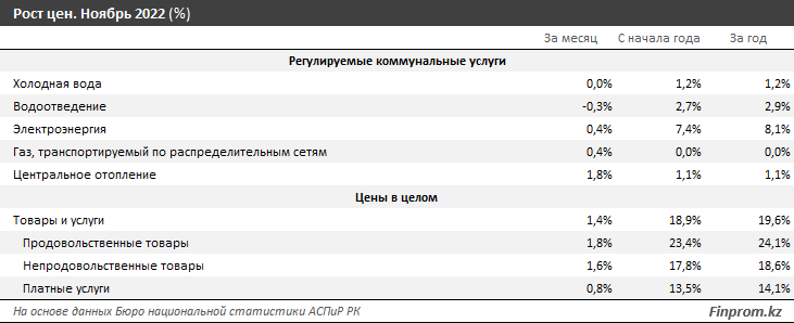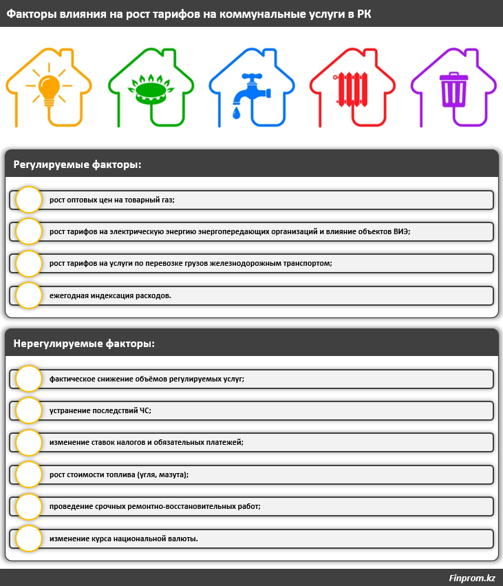 До сих пор тарифы на коммунальные услуги в РК не показывали значительного роста. Так, к примеру, при годовой инфляции в 19,6% и росте цен на платные услуги в целом на 14,1%, тарифы на газоснабжение в годовой динамике вообще не изменились, отопление подорожало на 1,1%, холодная вода — на 1,2%, канализация — на 2,9%, электроэнергия — на 8,1%.