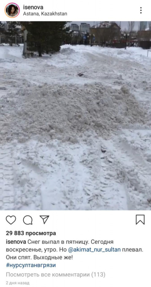 "Снег выпал в пятницу. Сегодня воскресенье. Но @akimat_nur_sultan плевал. Они спят. Выходные же!" - говорится в публикации Исеновой.