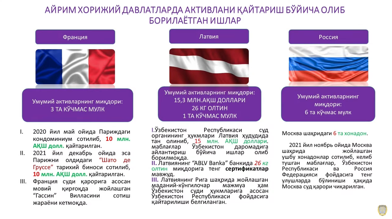 Он заявил, что Московский суд в 2021 году вынес окончательное решение о признании запроса Узбекистана о конфискации шести квартир. С февраля этого года идёт процесс по исполнению этого решения.