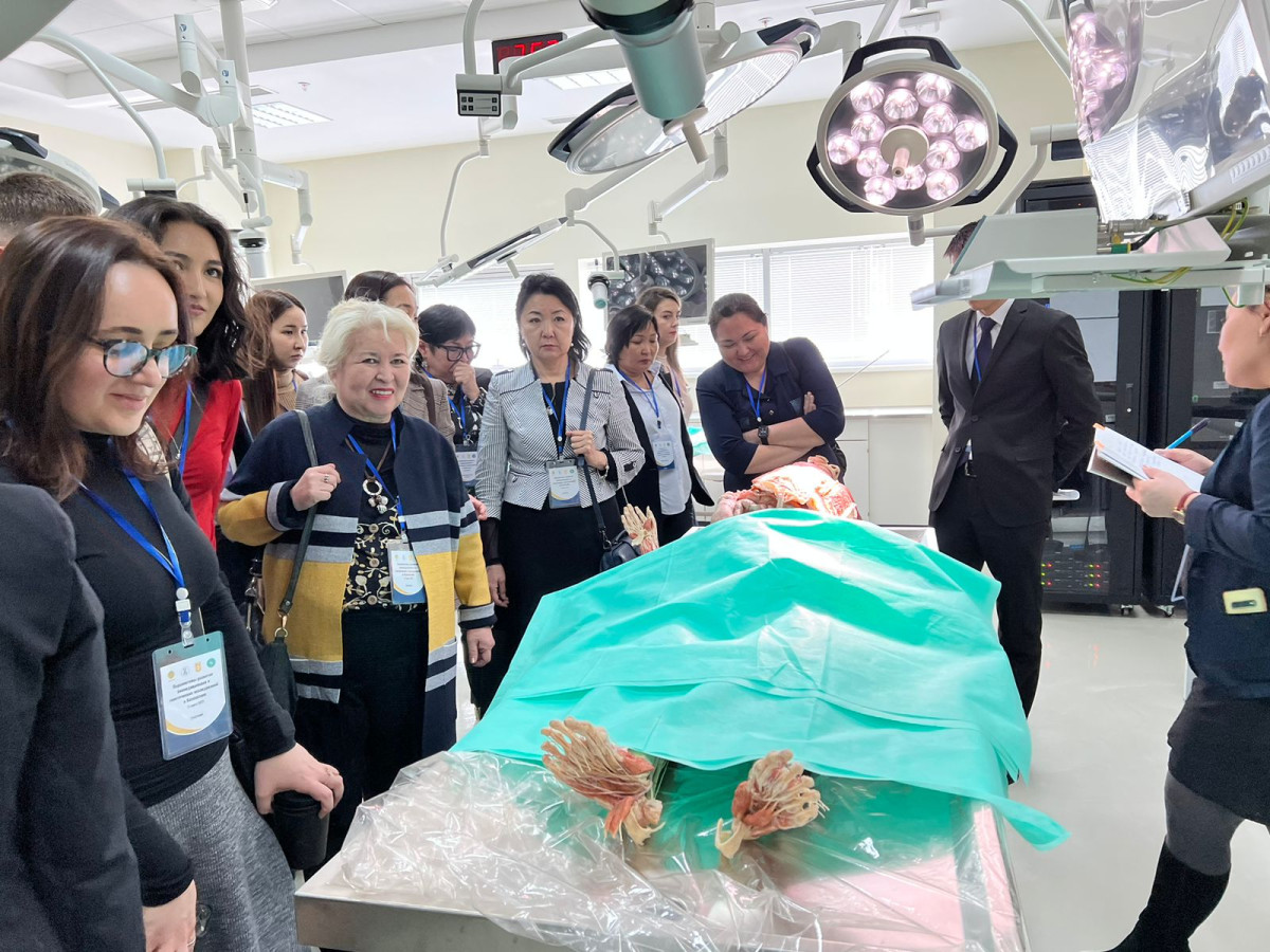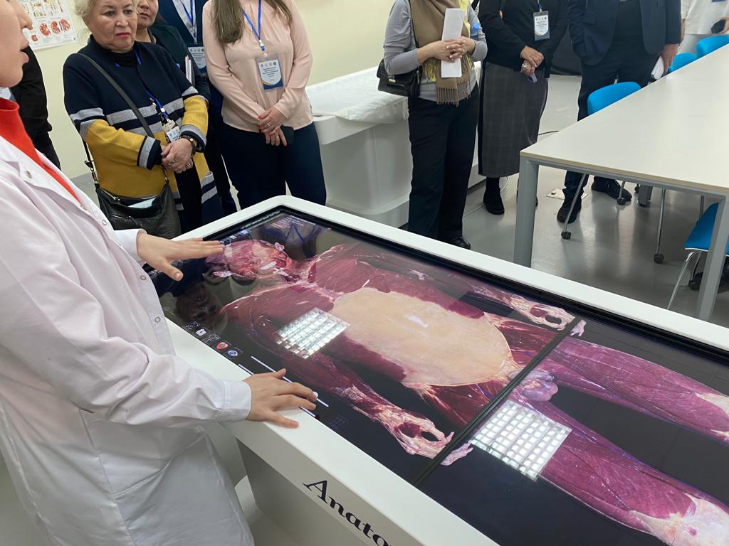 "Здесь проходят занятия. Особенность кабинета в том, что в нём есть пять диссекционных столов, на которых студенты обучаются анатомии, физиологии, патологической физиологии и в целом осваивают теоретические основы. Здесь также можно проводить диссекции. Это я могу вам сейчас продемонстрировать. На данном столе есть несколько ситуационных задач, нозологий и различных заболеваний на выбор, которые мы показываем студентам в теории, а потом и они самостоятельно изучают это на практике", - рассказала старший координатор лаборатории Жанар Мустапова.