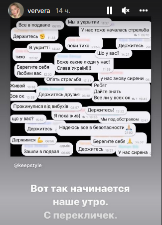 Исполнительница рассказала, что почти неделю каждое её утро начинается с переклички в соцсетях. Родные сообщают об обстановке в Киеве.