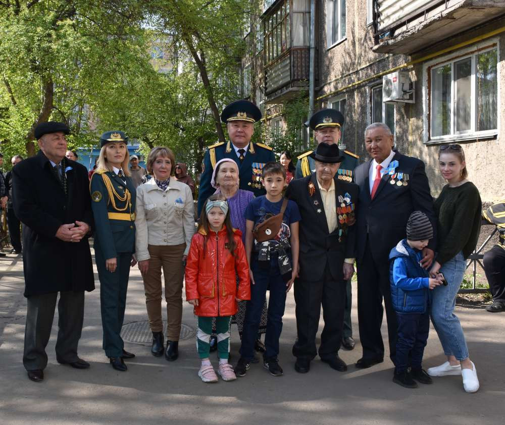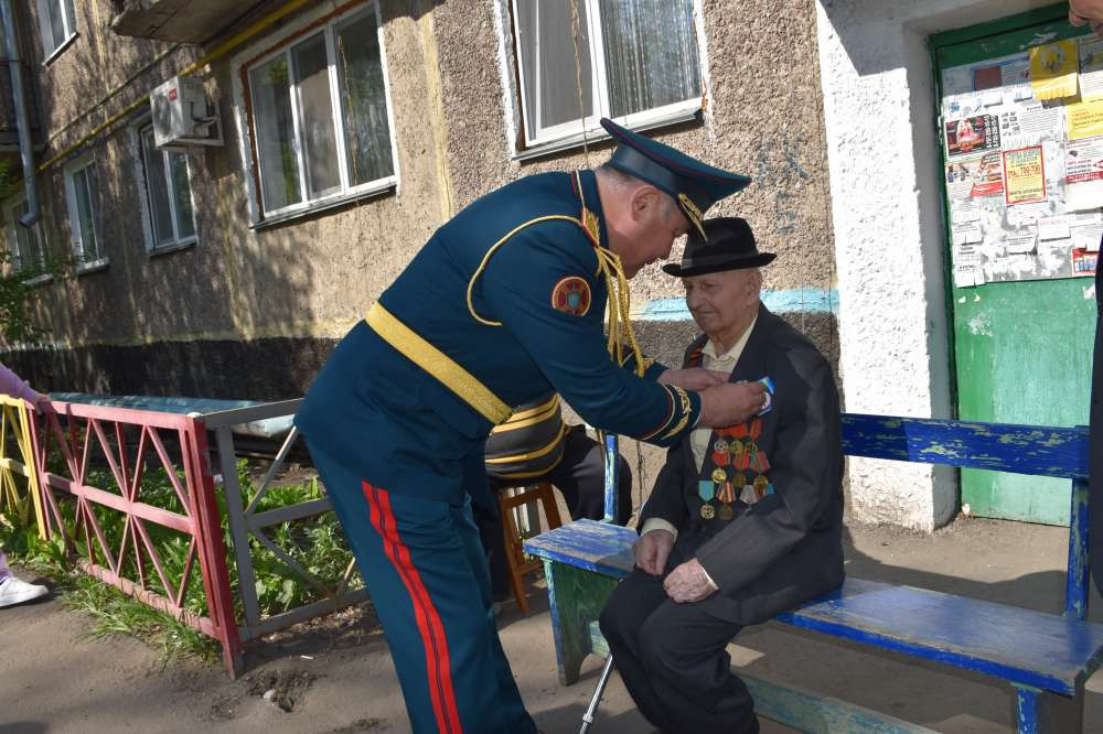 Во дворах у героев войны организовали мини-парад и концертную программу военного оркестра, звучали патриотические мелодии и слова поздравления. Затем гвардейцы парадного расчёта военной академии прошли торжественным маршем.