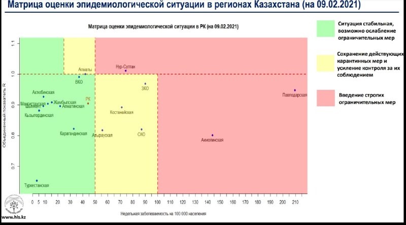 Опубликована матрица оценки эпидемиологической ситуации по коронавирусу в регионах Казахстана на 9 февраля 2021 года, передает BaigeNews.kz.