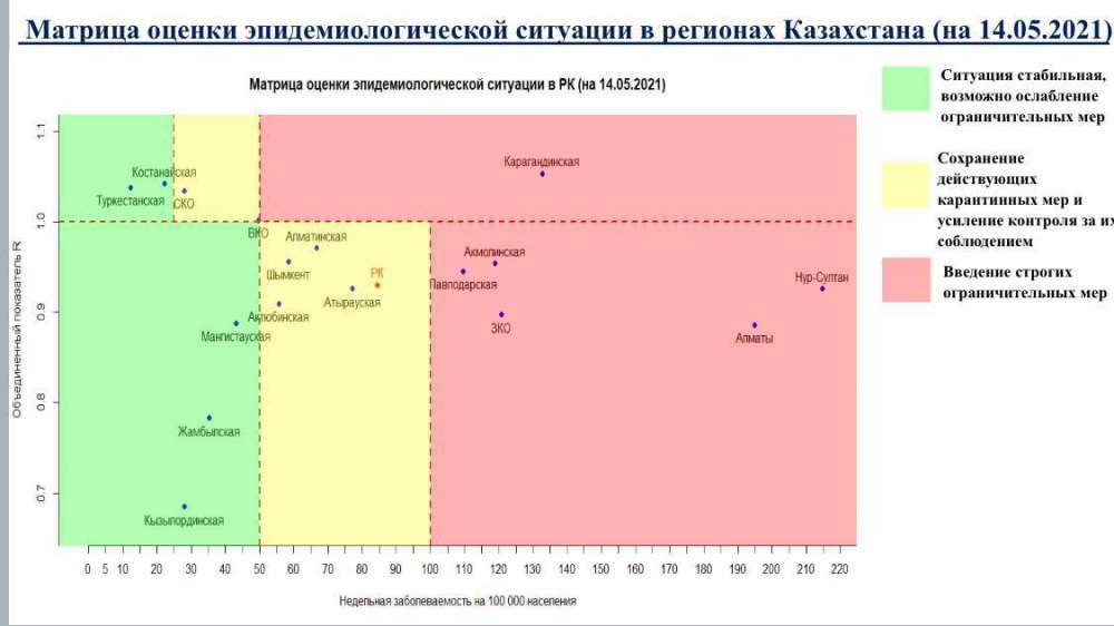 Опубликована матрица оценки эпидемиологической ситуации в регионах Казахстана на 14 мая 2021 года, передает BaigeNews.kz.
