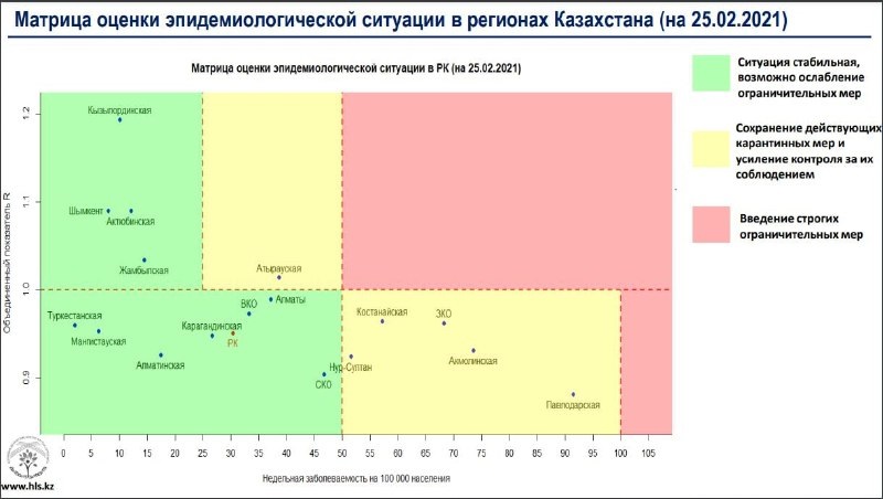 Опубликована матрица оценки эпидемиологической ситуации в регионах Казахстана на 25 февраля 2021 года, передает BaigeNews.kz.