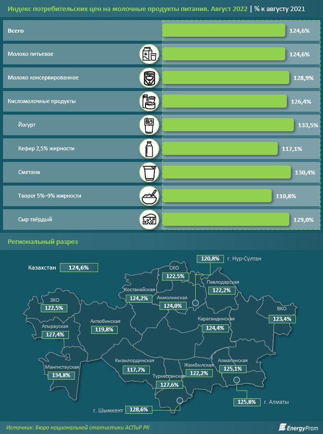 По итогам августа текущего года стоимость молочных продуктов выросла на 24,6% за год. Питьевое молоко подорожало на 24,6%, консервированное — на 28,9%, кисломолочные продукты — на 26,4%. Среди кисломолочных продуктов йогурт подорожал на 33,5%, кефир 2,5% жирности — на 17,1%, сметана — на 30,4%, творог 5%–9% жирности — на 10,8%, твёрдый сыр — на 29%.