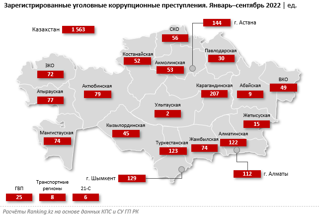 Согласно данным аналитиков, в тройку антилидеров по коррупции вошли: Карагандинская область - 207 случаев (с 2021 года рост в три раза), Астана - 144 случая (с 2021 года рост 2,9 процента) и Шымкент - 129 случаев (с 2021 года рост 25,2 процента). Меньше всего правонарушений зарегистрованно в Улытауской (два случая), Абайской (девять случаев) и Жетысуской (15 случаев) областях.
