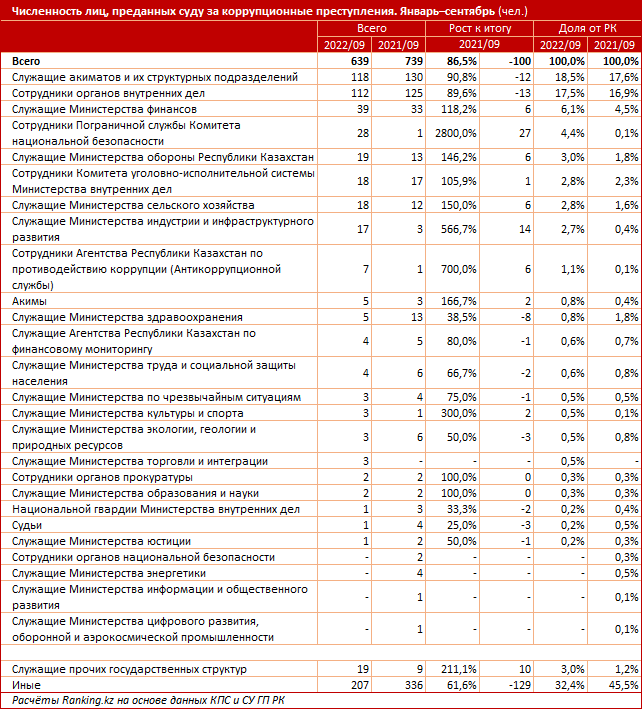 Аналитики отмечают, что количество преданных суду за коррупционные преступления лиц, с начала года составило 639 человек, что на 13,5 процента меньше чем в 2021 году.