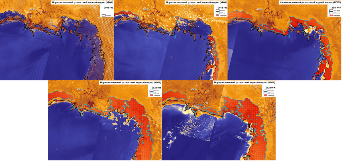 Эксперты также представили динамику изменения площади водного зеркала с 2008 по 2023 годы на территории Казахстана. Обширные площади обмеления моря наблюдаются на казахстанской части вблизи города Атырау, дельты реки Жайык.
