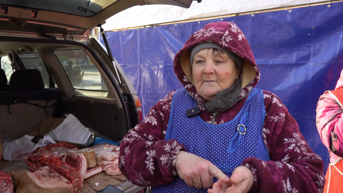 Сельчанка показывает на ряды мясников на ярмарке и говорит, что большинство из них – представители мясных магазинов или те, кто постоянно торгует на рынке. Женщина сокрушается, что вся продукция у них на прилавках куплена с личных подворий по низкой цене, а самим сельским жителям торговать в городе нереально.