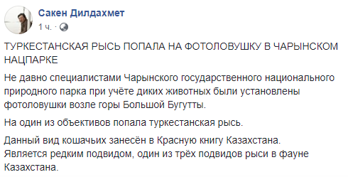 "Данный вид кошачьих занесён в Красную книгу Казахстана. Является редким подвидом, один из трёх подвидов рыси в фауне Казахстана", - пишет в своём посте Дилдахмет.