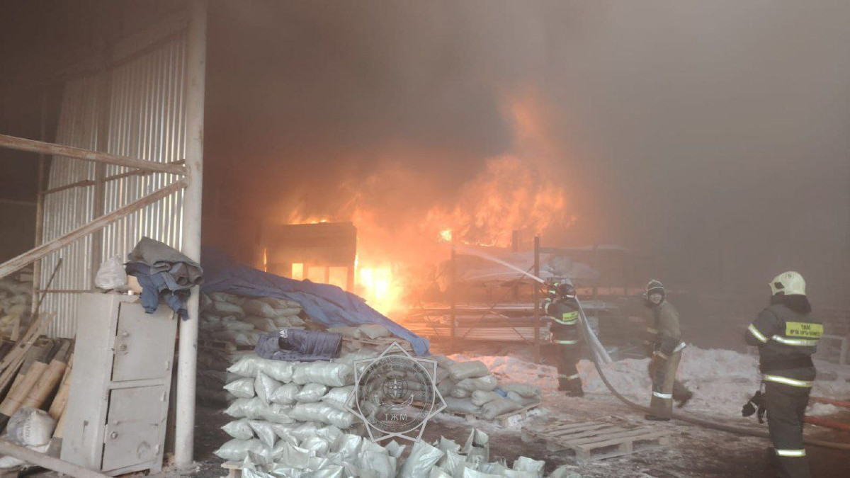 Крупный пожар на складе стройматериалов тушат в Алматинской области