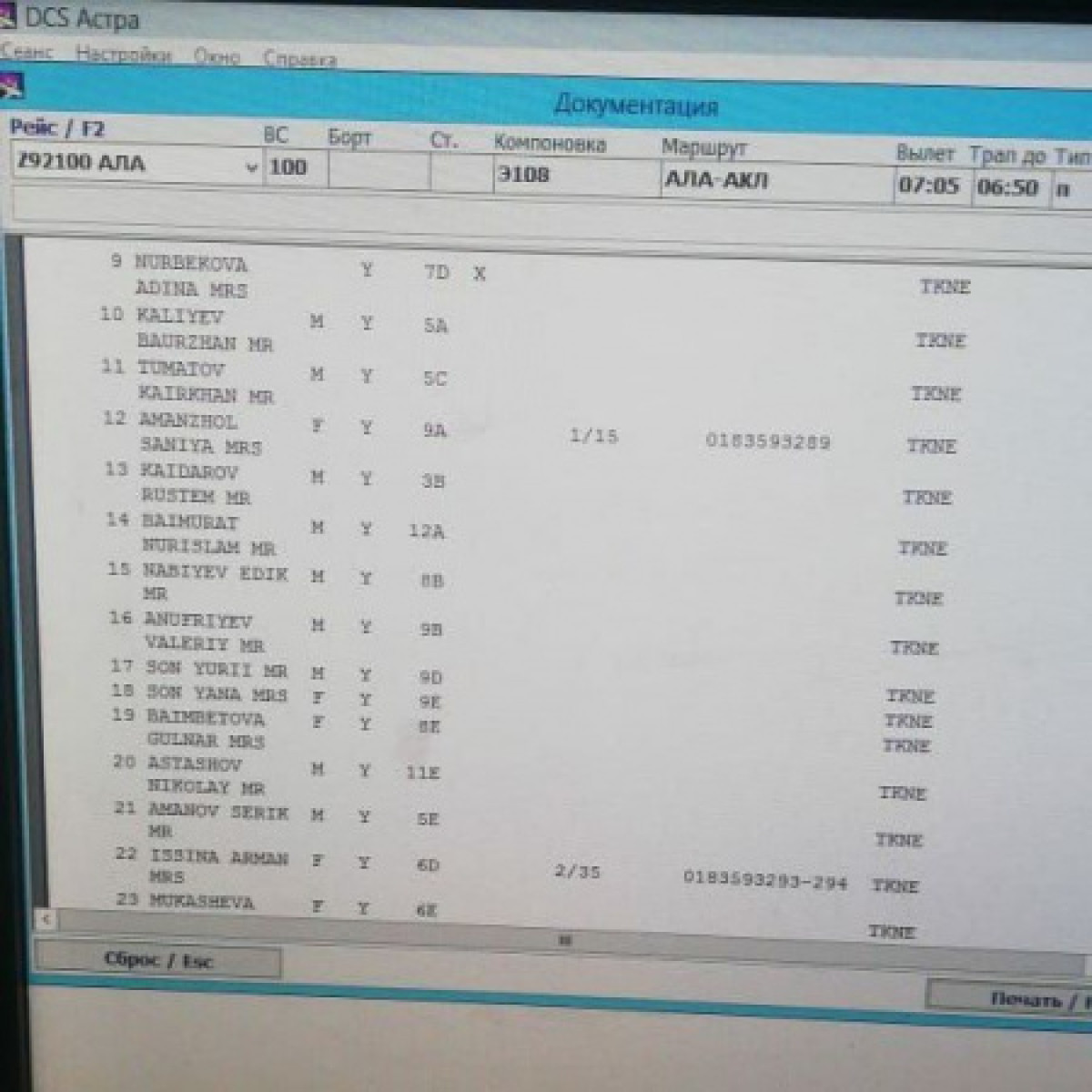 Список пассажиров рейса №Z2100 Авиакомпании Бек Эйр.