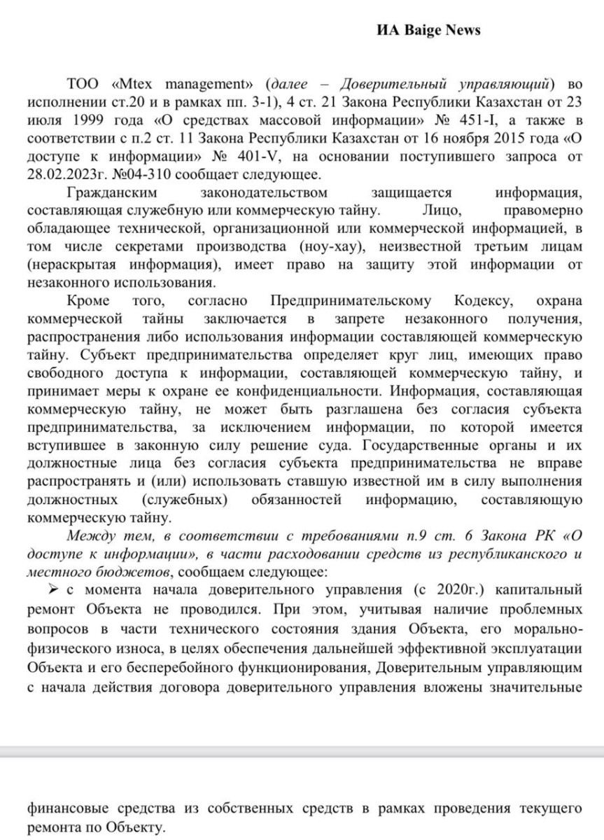 Редакция BaigeNews.kz также осталась без ответа на вопрос о расходах на ремонт. Расскажем подробнее.
