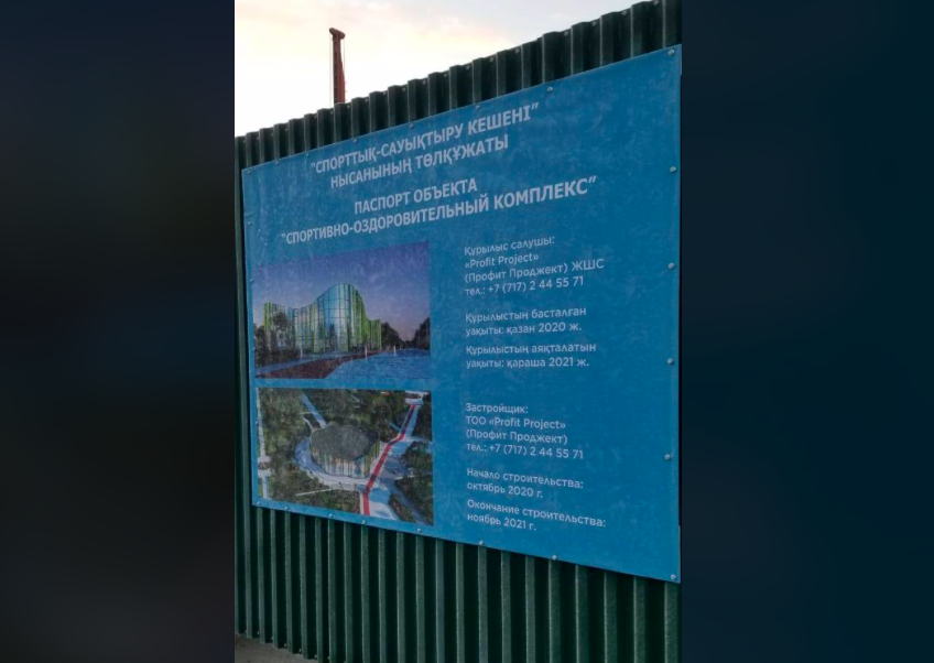 На паспорте объекта указан застройщик – ТОО "Profit Project". Сдать спорткомлекс компания планирует ровно через год.